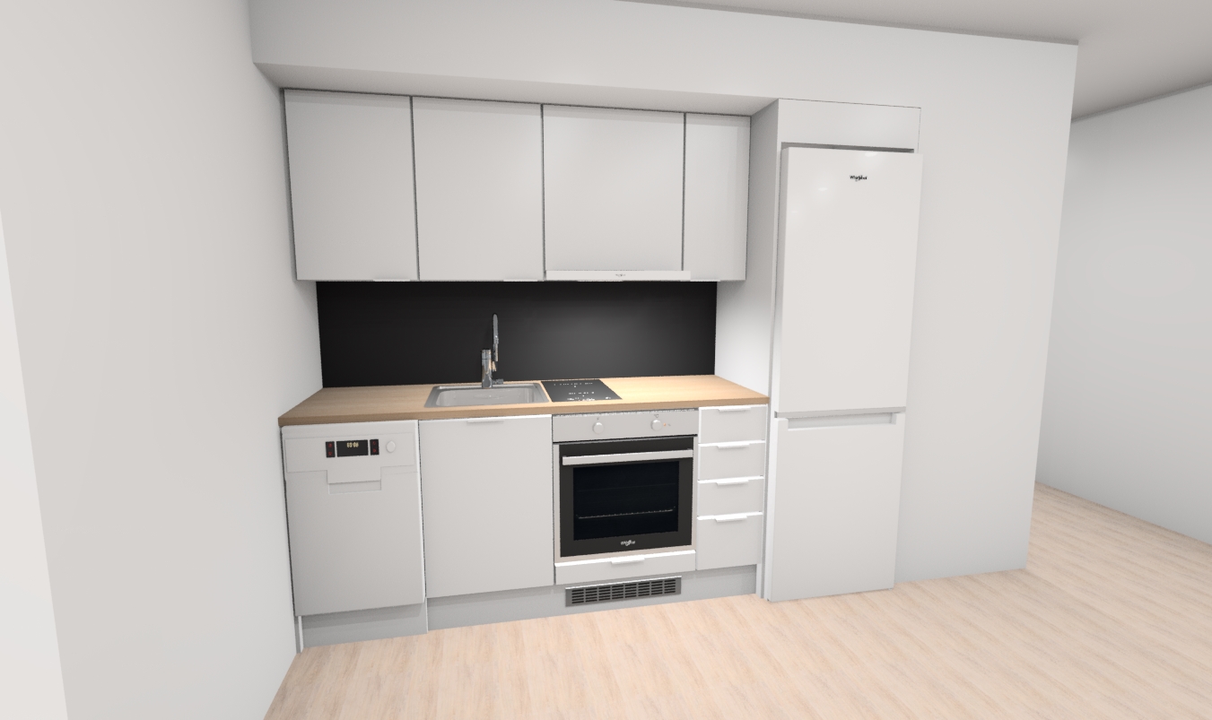 Valmiskeittiö on erinomainen valinta, kun haluat valmiiksi suunnitellun, toimivan ja tyylikkään kokonaisuuden nopeasti. Saat keittiöstä tarkat mittakuvat itsellesi sähköpostiin tilausvahvistuksen yhteydessä.